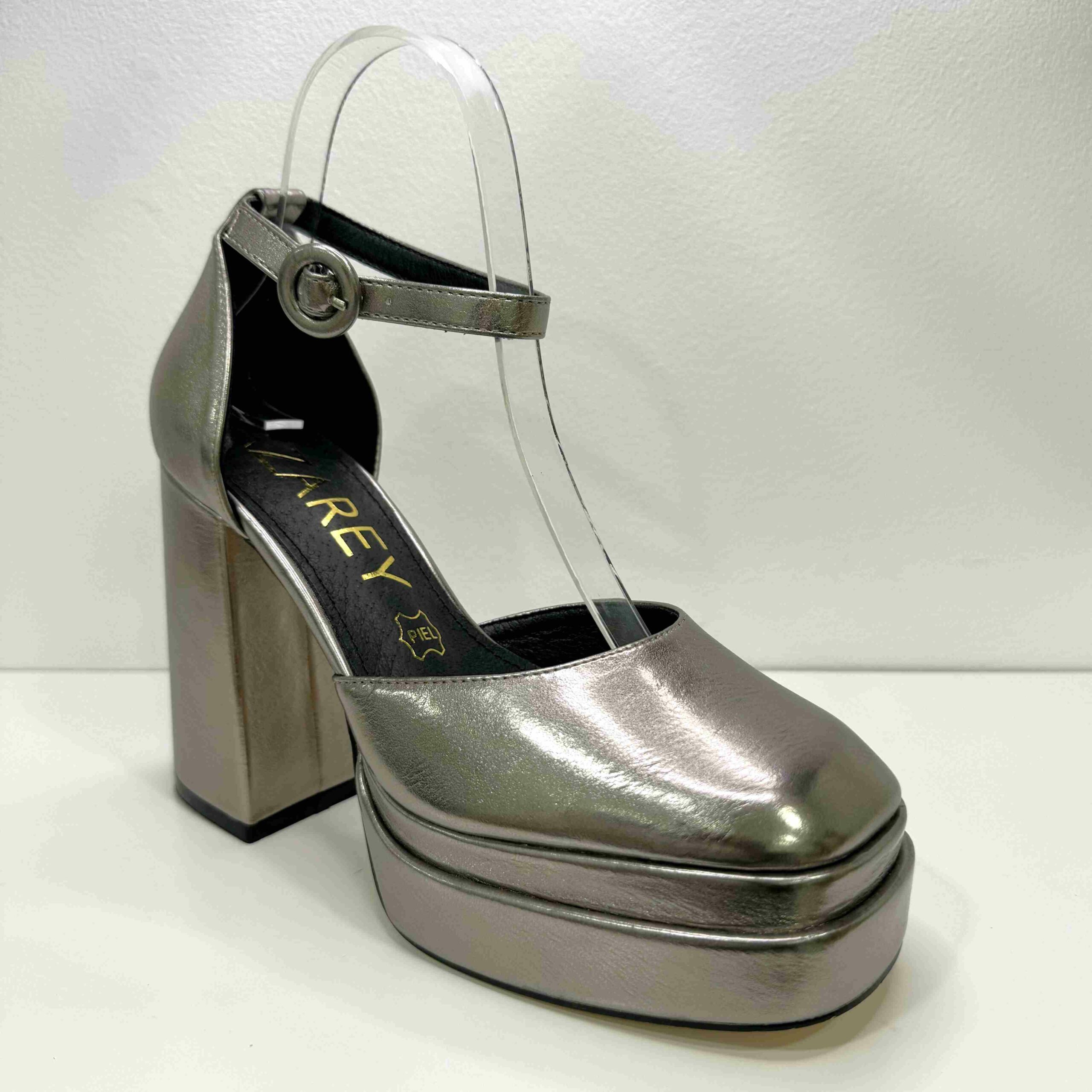 Tacón de 11cm y plataforma de 4cm. Tobillera con cierre de hebilla y corte en piel.