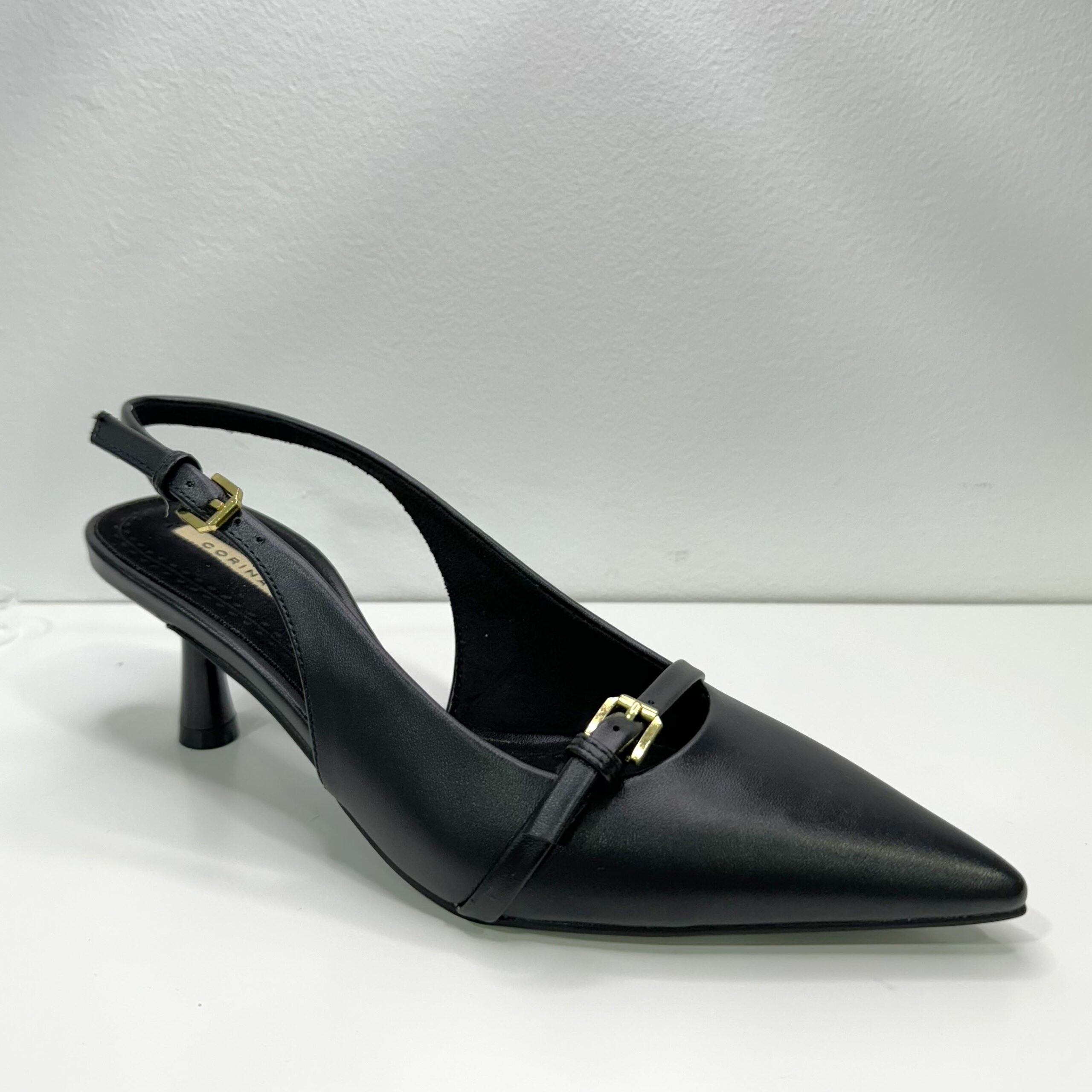 Salón destalonado acabado en punta. Detalle de tira fina con hebilla en la parte delantera. Tira trasera con hebilla. Altura de tacón 7cm.
